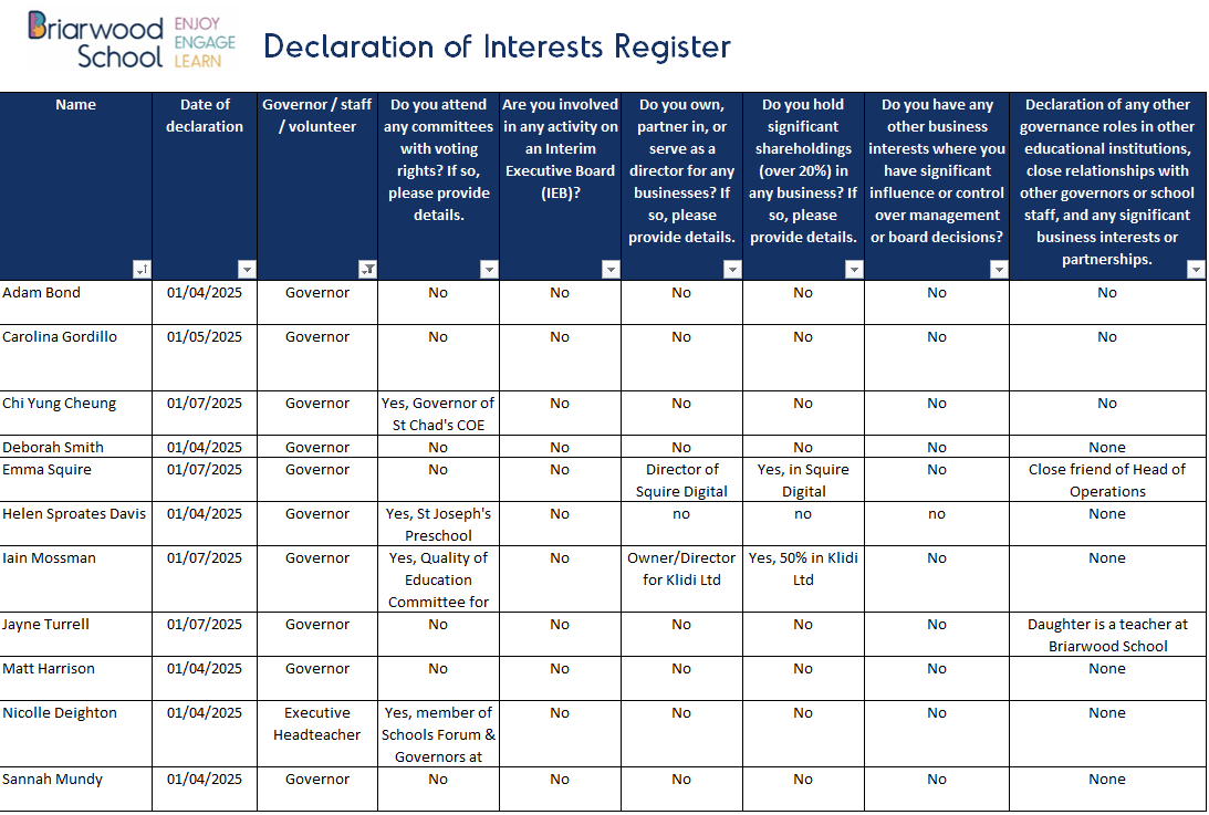 To comply with legal and regulatory requirements, all governors and relevant staff must declare any business, pecuniary, or financial interests in accordance with statutory guidance.